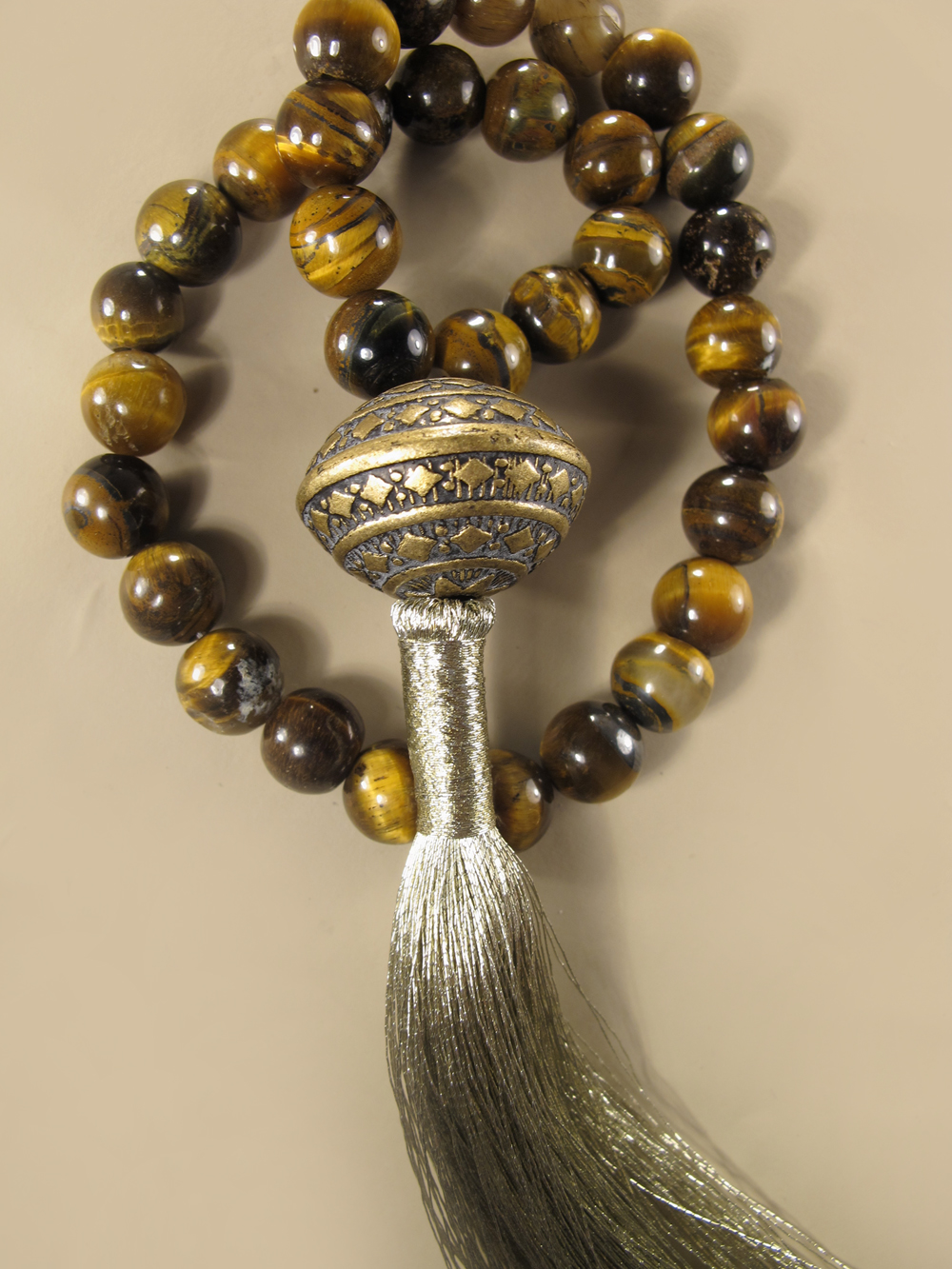 Состав: Четки из натурального тигрового глаза, бронзовый храм из пластика. Оформлены кистью светло-золотого люрекса.