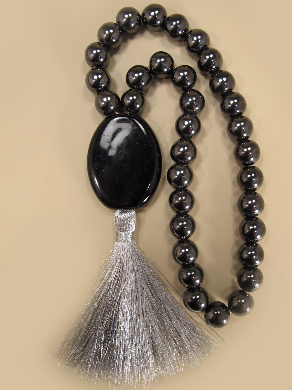 Состав: Четки из бусин среднего размера из гематита, с овальным храмом, оформлены серебристой кистью из люрекса.
