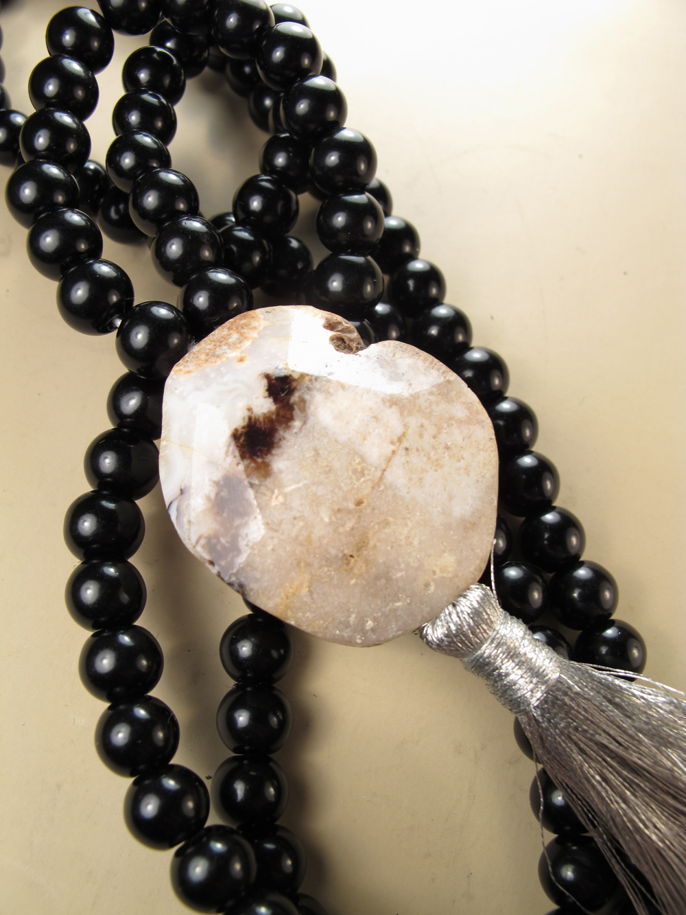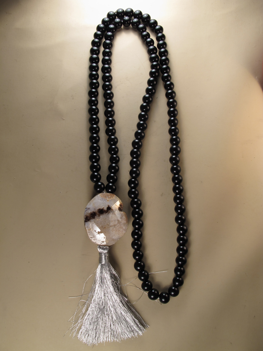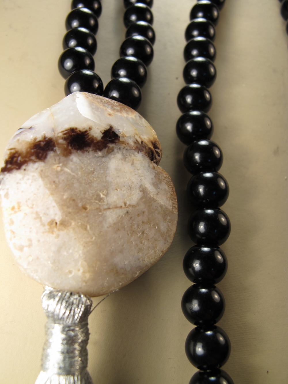 Состав: Четки из средних бусин, выполнены из пластика, с храмом из натурального бежевого агата неровной формы, оформленные серебристой кистью из люрекса.